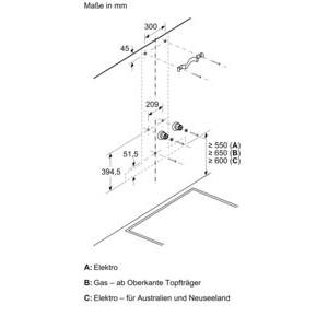 Technisches Schema mit Maßen in mm. Darstellung eines Geräts mit Anschlüssen und Abständen, beschriftet mit A, B, C.
