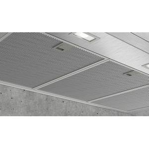 Deckenansicht mit metallischen, quadratischen Rasterplatten. Sichtbare Lüftungselemente und Betonelement.