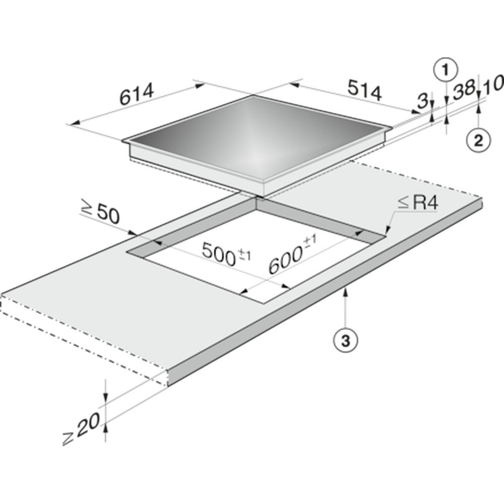 • Ausschnittmaße in mm (Tiefe) bei aufliegendem Einbau
