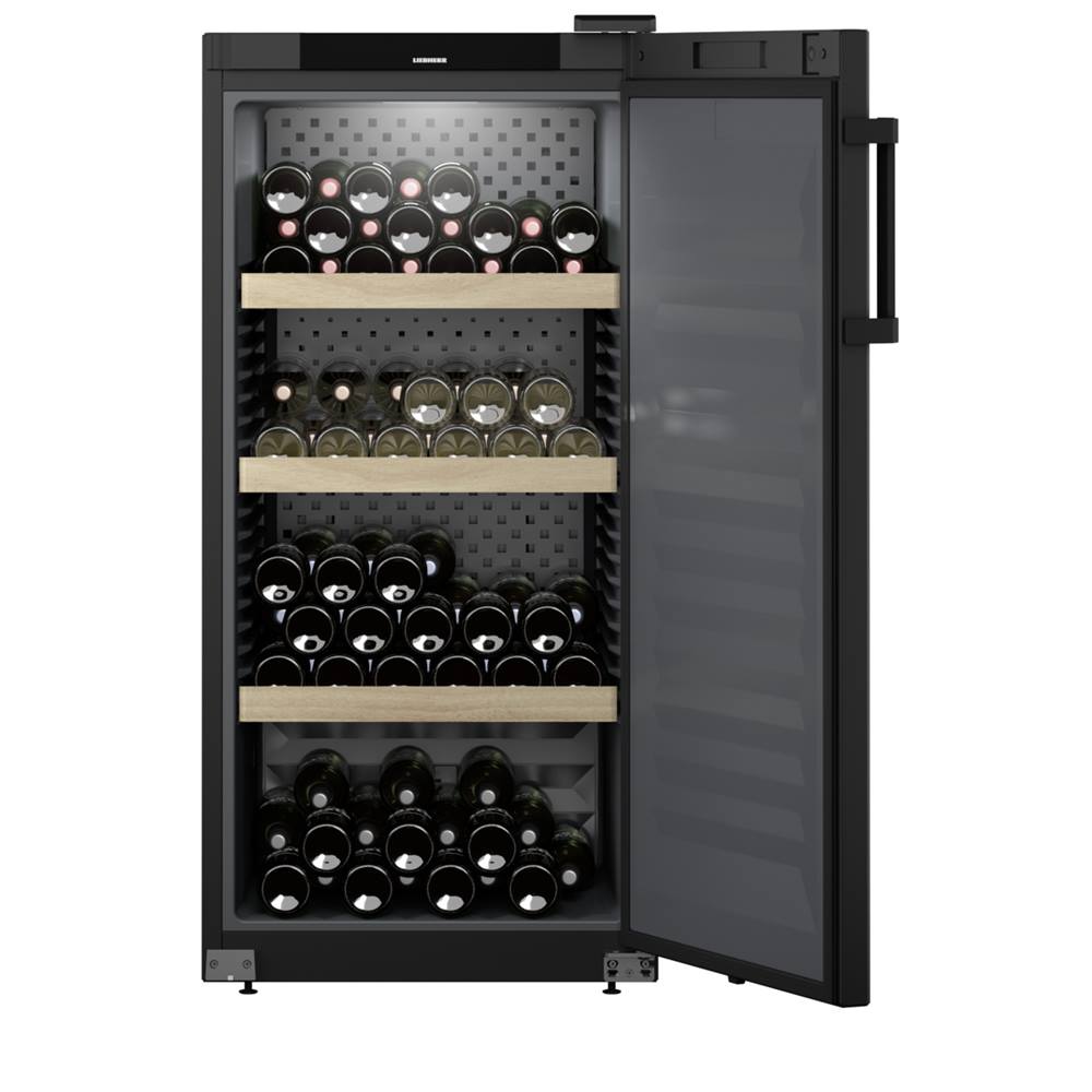 Weinkühlschrank von Liebherr mit geöffneter Tür, gefüllt mit Weinflaschen auf Holzregalen. Innenbeleuchtung ist sichtbar.