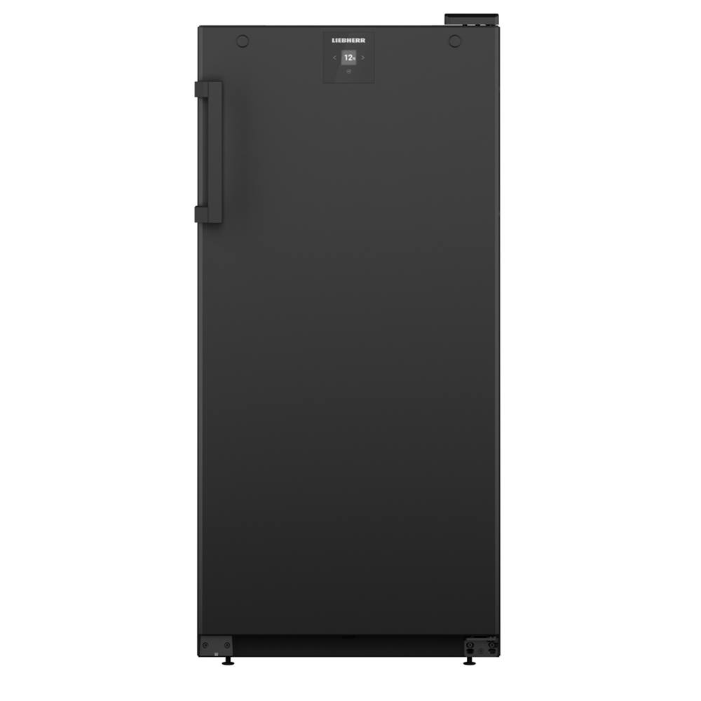 Schwarzer Kühl-Gefrierkombination von Liebherr mit digitalem Display und vertikalem Griff. Füße zur Nivellierung sind sichtbar.