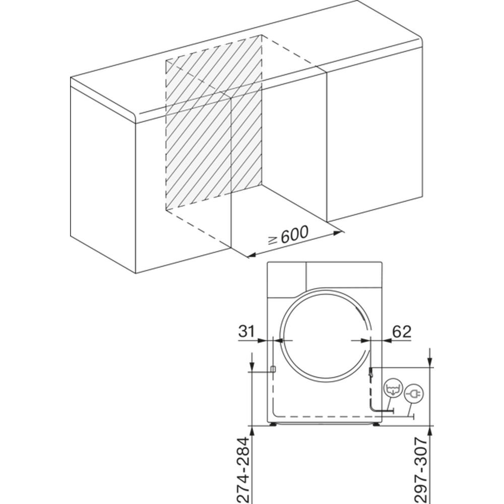 Zeichnung einer Waschmaschine mit Maßangaben: 535, 596, 600, 845-855 mm. Sicht von vorne und Seite, technische Darstellung.