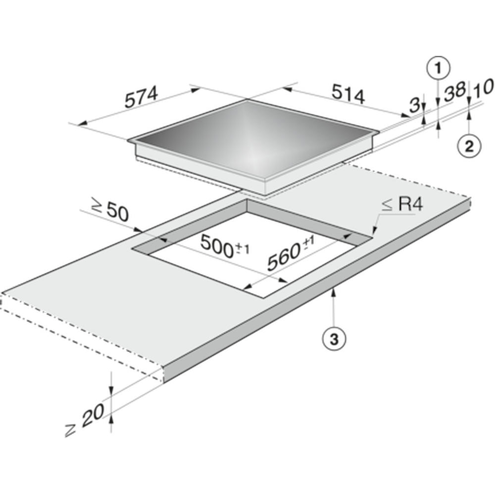 • Ausschnittmaße (B x T) bei aufliegendem Einbau in mm