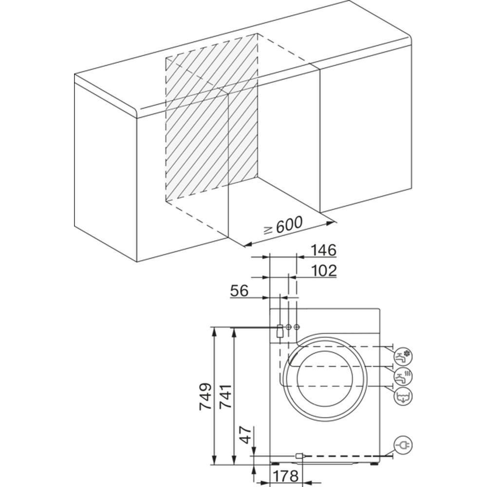 Waschmaschine, perspektivische Zeichnung, mit Maßen (535, 596, 600, 846-854). Frontal mit runder Tür.
