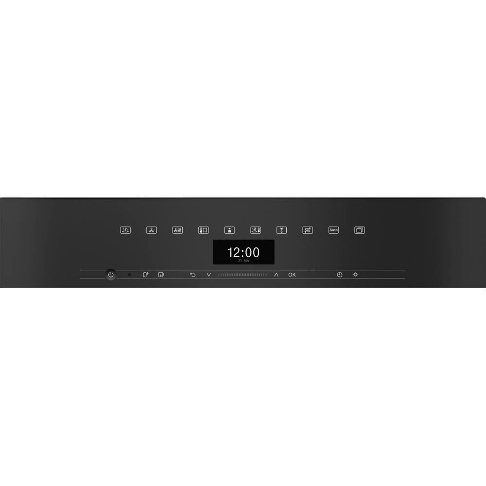 Design und Bedienkomfort vereint: Mit einem Fingerdruck lässt sich die Bedienblende öffnen und sanft schließen – ohne die Garraumtür zu öffnen. Hinter der Liftblende verbergen sich Wassertank, Kondensatbehälter, und das kabellose Speisenthermometer . Für beste Sicht auf das Display neigt sich Ihnen die Blende bei Betätigung der Taste leicht entgegen.