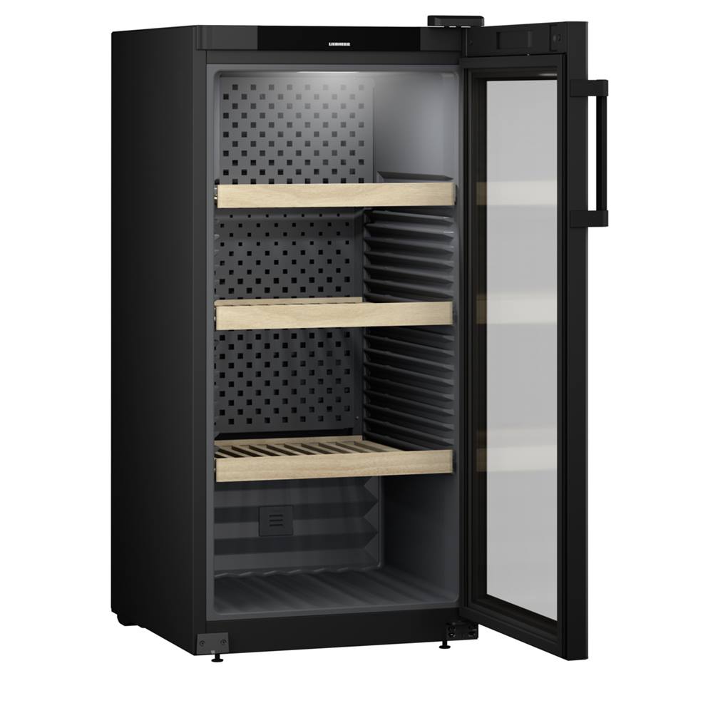 Weinkühlschrank der Marke Liebherr, gefüllt mit Weinflaschen. Schwarzes Gehäuse, Glastür mit digitaler Temperaturanzeige und Holzregale.