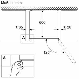 Technischer Plan einer Montageöffnung mit Maßen (600mm Höhe, ≥65mm, ≥20mm). Detail A zeigt Hand beim Einsetzen eines Bauteils in die Öffnung (125°).