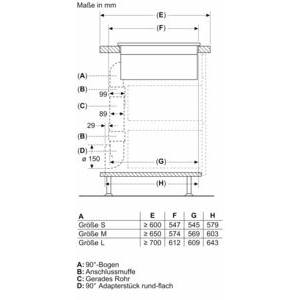 - Arbeitsplattentiefe ≥ 60 cm - gekürzte Auszüge (90° „S“ Flachkanalbogen HZ9VDSB4, männlich)