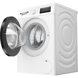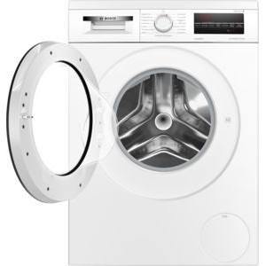 Weiße Frontlader-Waschmaschine von Bosch mit geöffneter Tür. Innenraum mit Trommel sichtbar. Bedienfeld oben rechts.
