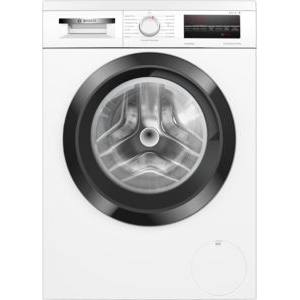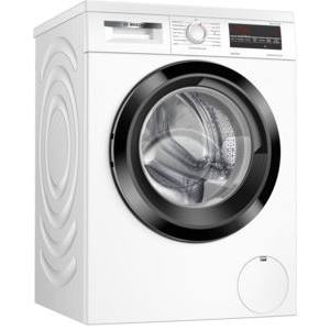 Weiße Frontlader-Waschmaschine von Bosch mit rundem Bedienknopf und digitalem Display. Schwarze Türöffnung.
