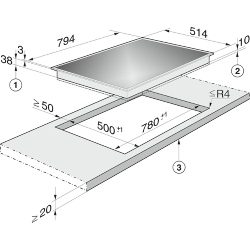 Ausschnittmaße in mm (Tiefe) bei aufliegendem Einbau